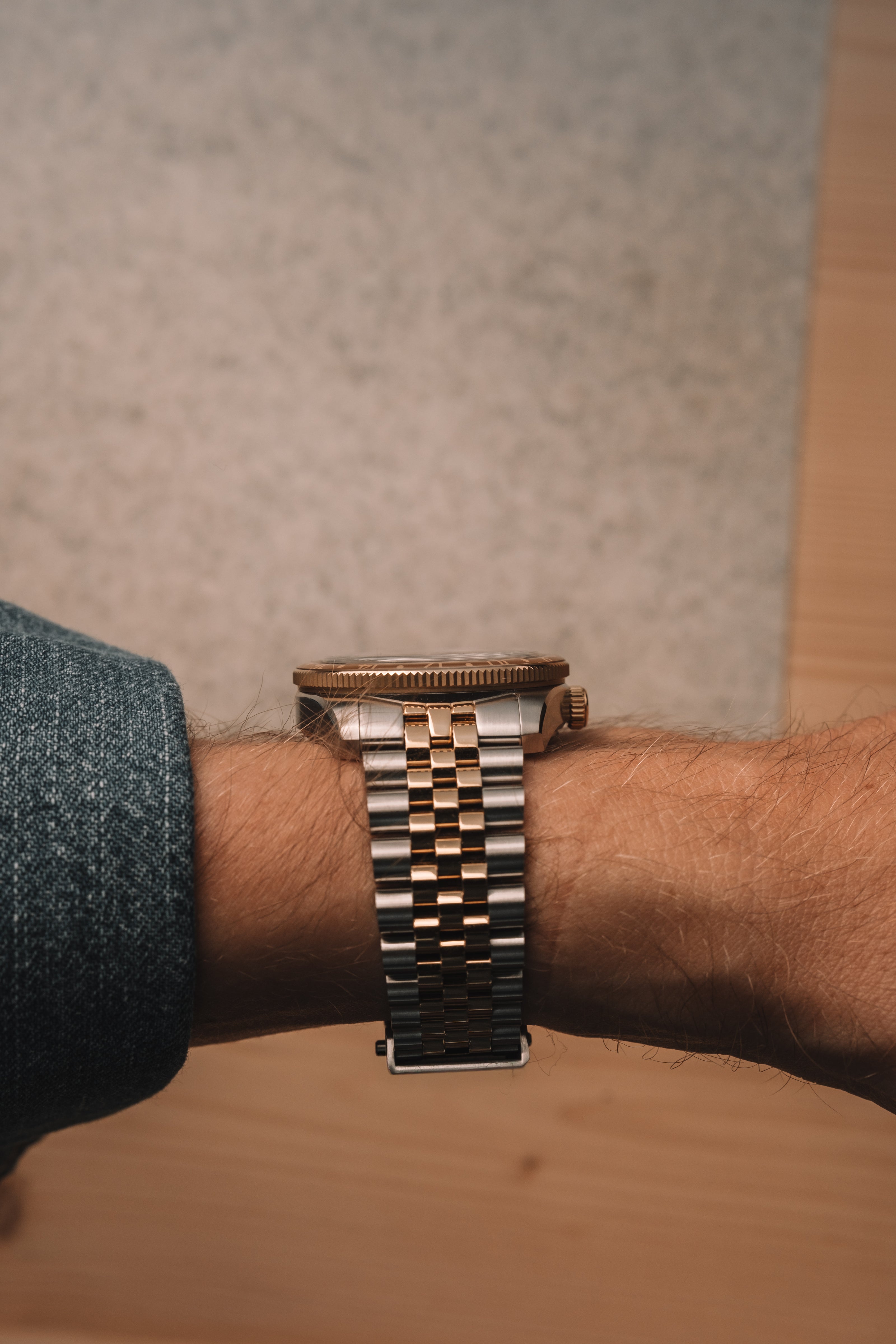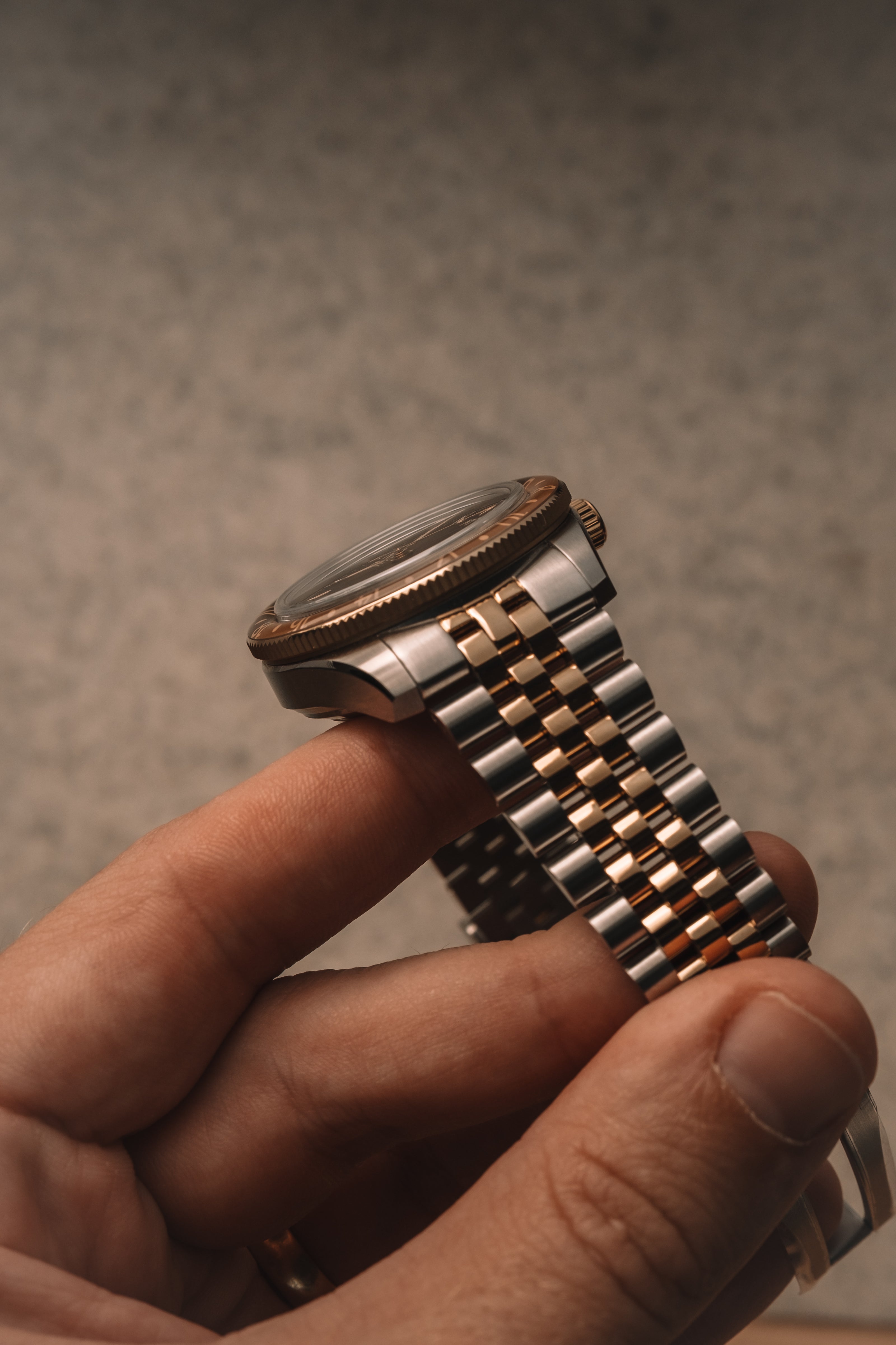 The Terra Two Tone sets itself apart with a silver satin case finished with gold-toned accents, complemented by a matching two-tone bracelet. This refined contrast enhances its vintage-inspired character while adding a touch of modern elegance.